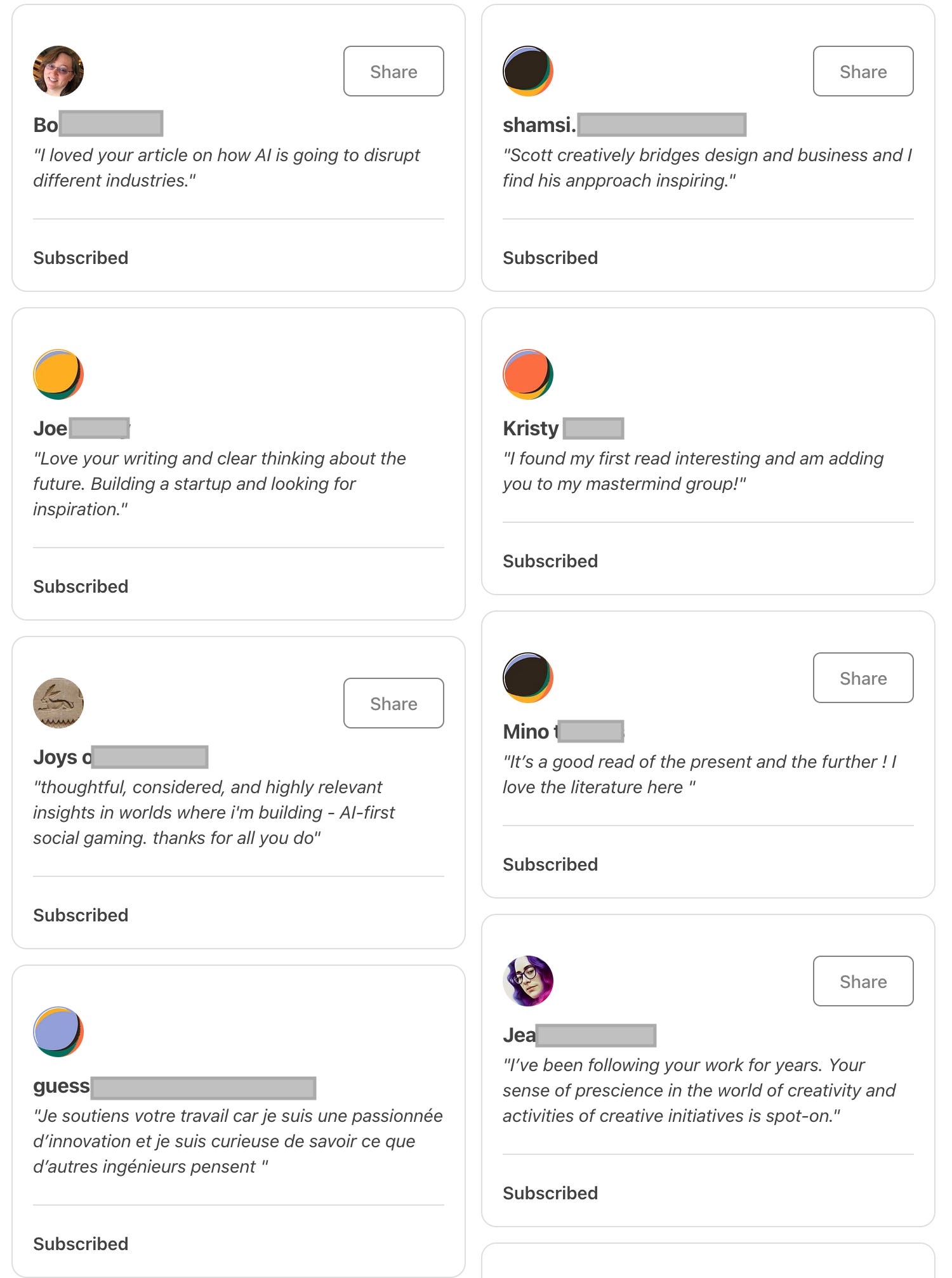 The monthly email of forecasts and implications is free and widely available for sign-up (and an annual summary is typically covered by other press publications and shared more broadly). It has tens of thousands of readers and generates quite a bit of discussion and feedback. However, there is a private section at the end of each edition intended for founders I work with and (as a paid tier) a smaller private opt-in audience (so I can take a bit more risk, and know who my audience is, and hopefully escape search indexing and AI training bots). As a subscriber, you’ll get the monthly list of forecasts, implications, as well as access to this bonus section covering provocative data (and its implications, start-ups I am seeing, and additional raw observations that I think are relevant. Paid subscriptions will help cover the cost of an editor (and provide a full-fledged experience participating in the creator economy). The majority of all subscription proceeds are donated annually to the Cooper-Hewitt National Design Museum, where I sit on the board, and other non-profits I support.